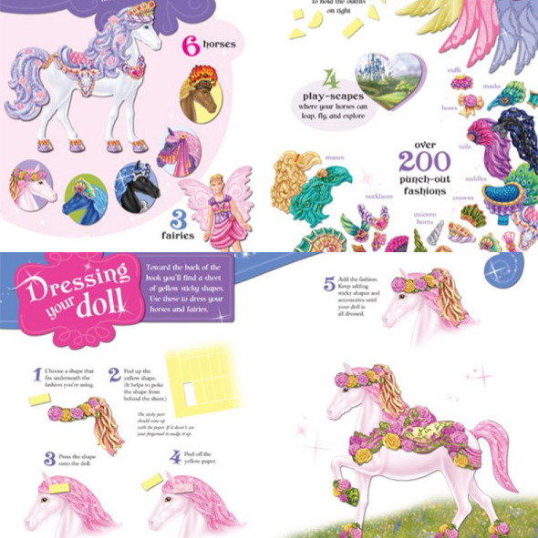 בעזרת הספר המופלא של חברת KLUTZ תיצרו לכם עולם מופלא ומלא פנטזיה וקסם, סוסים אצילים בצבעים שונים, עם כנפיים וזנבות מעוטרים וכמובן הפיות שמלוות אותם.