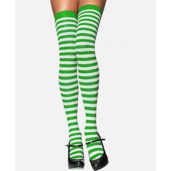 גרב פסים ירוק לבן >> גרביים מדליקות, עד מעל לברך, סטרצ'יות, מפוספסות בירוק ולבן. תוספת מדליקה לתחפושת של טינקרבל, לפרקון, שדונית, מכשפה, ועוד.